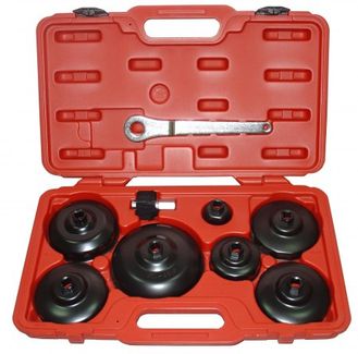 Съёмники изготовлены в форме чашек из штампованной инструментальной стали. Для предотвращения появления коррозии, каждый съёмник покрыт порошковой эмалью. Съёмники способны выдерживать большие нагрузки. Каждая чашка снабжена усиленной площадкой с посадочным квадратом. Конструкция съёмников в форме чашек исключает повреждение масляного фильтра при его снятии и установке. Возможность использовать привод с посадочным квадратом 1/2"; 3/8"; гаечный ключ или торцевую головку на 21 мм. Для удобства на каждой чашке имеется маркировка её размера. Эта же маркировка дублируется на ячейке хранения в кейсе. Комплектность: Съёмники-чашки: ? 36мм 6 граней — 1 шт. Подходит для MERCEDES BENZ (AXOR BR400, ATEGO BR900, ACTROS BR500) / SCANIA (PDE V8-MOTOR, HPI-MOTOR) ? 74мм 14 граней — 1 шт. Подходит для MERCEDES BENZ (Sprinter Motor Version 600) / VW (Transporter)KA-? ? 106мм 14 граней — 1 шт. Подходит для MAN (8-10 To. – Serie L2000) SCANIA (PDE-Motor) / FIAT (DUCATO 2.5D/TD) / IVECO ? 107мм 15 граней — 1 шт. Подходит для VOLVO / IVECO / RENAULT / SCANIA ? 108мм 15 граней — 1 шт. Подходит для VOLVO / IVECO / RENAULT / SCANIA ? 108мм 18 граней — 1 шт. Подходит для RENAULT Transporter (Master, Traffic 2.4 / 2.5 / 2.8 D/TD) / OPEL (Movano) ? 135мм 18 граней — 1 шт. Подходит для MAN(18 – 48 To. Serie F2000, TGA) Ленточный съемние до 160мм. — 1 шт. Ключ на 21мм. — 1 шт. None