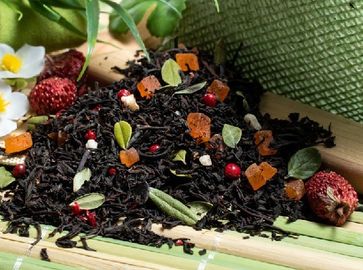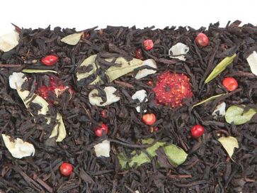 Роскошный купаж черного крупнолистового чая с клубникой, кусочками ананаса, лимона, украшенный листочками брусники и горошенками розового перца. Дополнен состав превосходным ароматом клубники со взбитыми сливками.