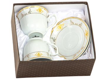 Чайный сервиз Сирма 4 предмета может стать замечательным подарком на любой праздник. Посуда из тонкого прочного фарфора станет идеальным дополнением уютного чаепития. Чашки и блюдца украшены элегантным золотым декором, который создает особую атмосферу праздника даже в будний день.<br>