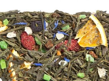 Чай зеленый (Китай) крупнолистовой с ягодами клубники, кусочками яблока, апельсина, лепестками василька создаст позитивное настроение и теплую атмосферу в кругу друзей. Вкус дополнен нотками тропических фруктов.