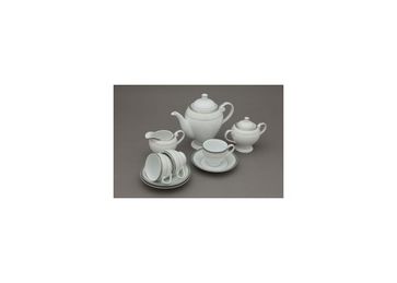 Необыкновенно элегантное сочетание серого и белоснежного с серебристой окантовкой по краям. В сервиз входят: 1 - чайник с крышкой; 1 - сахарница с крышкой; 1- молочник; 6 - чашек чайных; 6 - чайных блюдец. None