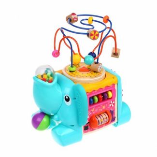 Развивающий игровой центр «Слонёнок» сочетает в себе так много интересного! На спинке у слоника расположен увлекательный лабиринт, сквозь извилистые дорожки которого малышу нужно будет провести забавные бусины разного цвета, размера и фактуры. На левой стороне слонёнка имеются счёты, которые познакомят ребёнка со счётом от 1 до 5, а также крутящийся барабан. На правой стороне игрушки тоже имеются развивающие элементы: крупные пуговички с забавными изображениями можно катать по дорожкам. Во рту у слонёнка расположен шарик с верёвочкой: если потянуть за него, в прозрачном отсеке на хоботе весело запрыгают разноцветные шарики. Хвост слоника представляет собой рычаг, приводящий в движение вращающиеся шестерёнки!