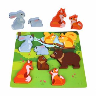 В составе игрового набора -- 1 основание для игры квадратной формы и 8 фигурок-вкладышей в виде взрослых животных (мишки, лисички, зайчика и белочки) и их детёнышей. Малышу предстоит правильно расположить все красочные вкладыши в соответствующие им по форме контурные отверстия, чтобы все дети оказались рядом со своими родителями.