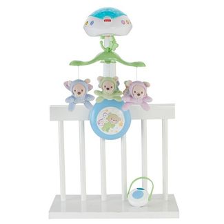 Замечательный мобиль-проектор от компании Fisher Price. Он надежно крепится на бортике кроватки при помощи удобного ремешка, включается и выключается тумблером. Мобиль оснащен звуковыми эффектами, есть 3 режима звука - воды, леса и приятные мелодии. Громкость регулируется. В процессе звучания музыки срабатывают и световые эффекты - переменно загораются три лампочки на проекторе. Ну и самое главное - медленно кружащиеся 3 плюшевые медвежонка, за которыми с удовольствием и любопытством будет наблюдать ваш малыш. Для удобства предусмотрен пульт дистанционного управления, с помощью которого вы сможете включать музыку и переключать мелодии.В темноте лампочки проектора светят на потолок, образуя очаровательные звездочки - в такой теплой и уютной атмосфере крохе будет приятнее засыпать и спокойнее просыпаться ночью.Для работы требуются батарейки:-в мобиль - 4 х АА/LR6 1.5V-в пульт - 2 х ААА/LR03 1.5V None