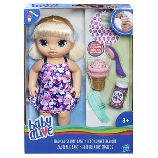Куколки Baby Alive от компании Hasbro порадуют любую девочку. Они очень симпатичные, качественные, оснащены множеством функций, и в комплекте с каждой вы найдете дополнительные аксессуары для более увлекательной игры.У малышки большие голубые глазки и мягкие светлые волосы, которые можно расчесывать. На ней надето очаровательное синее платьице в белый, розовый и сиреневый цветочек. Чтобы не испачкать такое красивое платье, на куколку можно надеть передник. Одежда и передник легко снимаются: малышку можно переодевать.Чтобы накормить куколку мороженым, достаточно просто поднести его к ее рту. Верхняя часть мороженого вдавится внутрь, словно малышка действительно его съела. После этого стаканчик можно снова наполнить мороженным: при нажатии ложкой на мороженое его центральная часть расправится, словно вы действительно наполнили стаканчик.Девочке понравится играть в дочки-матери с такой замечательной куколкой и заботиться о ней.Особенность набора:- у куклы подвижные конечности;- мягкие волосы куклы можно расчёсывать;- с баночкой мороженого, посыпкой и ложкой можно играть в кормление куколки;- съёмный нагрудник и платье;- высота куклы 31,5 см.Состав набора:- кукла;- расчёска;- нагрудник;- стаканчик мороженого;- баночка с посыпкой.Внимание! Мороженое и посыпка являются игрушечными! None