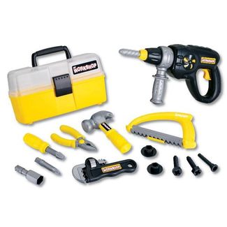 Набор инструментов для юного мастера ( электорошуруповерт, ящик для инструментов, плоскогубцы, винты, отвертка, ножевка).Этот набор Keenway будет самым желанным для мальчика. Маленькие мужчины очень любят выкручивать болты, играть с молотком, изображая хозяйственного папу. А если в наборе собрано много инструментов, то ребенок будет играть с ним, перебирая все по очереди и пробуя пилить, забивать гвоздь и работать с отверткой, пытаясь закрутить очередной винтик. В набор входит пластиковая ножовка, удобная для маленькой ручки, молоток, плоскогубцы, которые выглядят как настоящие. Кроме того, в наборе имеется электрошуруповерт, который при включении вертится и издает звуки, напоминающие настоящий инструмент. В ящике для инструментов помещается все - и разводной ключ, которым ребенок сможет играть, пытаясь открутить большие гайки, и отвертка, позволяющая играть с шурупами.Игровые наборы инструментов позволят малышу почувствовать себя взрослым мужчиной и настоящим мастером. Он даст возможность ознакомиться с главными инструментами, необходимыми при ремонтных работах. Играя таким набором, ребенок учится помогать своему папе и изучает основной комплект инструментов, а так же начинает понимать, для чего они необходимы. Закручивая винтики, малыш развивает мелкую моторику и логическое мышление.Предназначен набор инструментов для игры детям от 3 лет. Для работы электрошуруповерта необходимы 2 батарейки категории АА, которые находятся в комплекте. Продукция сертифицирована, экологически безопасна для ребенка, использованные красители не токсичны и гипоаллергенны. None