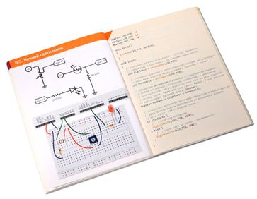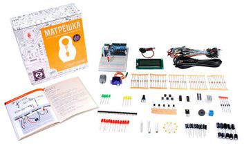Если вы хотите начать работать с Arduino, но у вас нет опыта и нет базовых радиодеталей и приспособлений, набор "Матрёшка" — это лучший выбор. В нём вы найдёте самую распространённую платформу Arduino Uno, набор радиодеталей, провода, макетную плату, а самое главное — красочную лаконичную обучающую брошюру, которая с нуля научит вас делать собственные электронные устройства. Брошюра содержит как теоретическую часть, которая расскажет о фундаментальных понятиях электричества и схемотехники, так и практическую часть с примерами создания 20 устройств. Комплектация "Матрёшка Z" содержит всё необходимое, чтобы собрать все 20 устройств. Это самая полная комплектация линейки "Матрёшка". Понять разницу между наборами можно из сравнительной таблицы. Наборы упакованы в красивые коробки, которые радуют глаз. Поэтому "Матрёшка" без проблем может выступить в качестве отличного подарка. Наборы "Матрёшка" рекомендованы для мужиков от 14 лет. Хотя, пользуясь папой или особо продвинутым интеллектом, комплекты могут использовать и дети от 10 лет. В комплекте 1 x Платформа Arduino Uno 1 x Монтажная площадка для Arduino 1 x Макетная плата Breadboard Half 30 x Резисторы на 220 Ом 10 x Резисторы на 1 кОм 10 x Резисторы на 10 кОм 1 x Переменный резистор (потенциометр) 1 x Фоторезистор 1 x Термистор 10 x Конденсаторы керамические на 100 нФ 10 x Конденсаторы электролитические на 10 мкФ 10 x Конденсаторы электролитические на 220 мкФ 5 x Транзисторы биполярные 1 x Транзистор полевой MOSFET 5 x Диоды выпрямительные 12 x Светодиоды 5 мм красные 4 x Светодиоды 5 мм зелёные 4 x Светодиоды 5 мм жёлтые 1 x Трёхцветный светодиод 1 x Светодиодная шкала 1 х 7-сегментный индикатор 5 x Кнопка тактовая 1 x Пьезо-пищалка 1 x Выходной сдвиговый регистр 74HC595 1 x Инвертирующий Триггер Шмитта 1 x Клеммник нажимной 65 x Соединительные провода "папа-папа"
