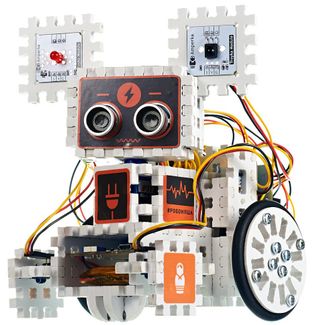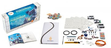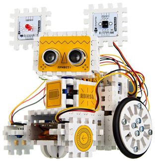Откройте для юного инженера мир робототехники и соберите с ним первого робота. Конструируйте марсоходы с дистанционным управлением, стройте роботов-следопытов и устраивайте бои сумо. Собирай! Программируй! Управляй! Мы рекомендуем конструктор "Робоняша" робототехникам с 12 лет. Будь ваш юный инженер новичком в электронике или закалённым в соревнованиях робототехником, в этой коробке он найдёт для себя не только увлекательное хобби, но и, возможно, будущую профессию. Разобраться в основах робототехники и программирования поможет красочный буклет — минимум теории, максимум практики. Конструктор безопасен — напряжение питания в модулях робота не превышает 9 вольт, а сборка не требует пайки и дополнительных инструментов. Как собрать робота? Полная сборка Робоняши занимает около двух часов. Чтобы превратить её в увлекательное приключение и рассказать начинающему инженеру об основах робототехники, мы разбили процесс на 12 экспериментов: от самых простых — вроде сборки сенсорных выключателей, к более сложным — роботу-марсоходу или борцам сумо. Каждый эксперимент сопровождается цветной схемой сборки, необходимой теорией и готовыми программами. Постепенно мы рассказываем обо всех электронных модулях, а робот становится всё сложнее и умнее: Прожектор Сигнальная колонна Сенсорный выключатель Миксер Одометр Спидометр Марсоход Чистюля Следопыт Нехочуха Прилипала Робо-сумо Мозг набора — Iskra JS, миниатюрный компьютер, говорящий на JavaScript. Лаконичные скрипты управляют внешними электронными модулями. Соединяйте модули шлейфами с платой Troyka Shield. К хабу одновременно подключатся все модули набора и ещё останется место под будущие доработки. Соберите корпус и голову робота из элементов структора. Вставьте сервопривод и моторы, закрепите колёса — ваш робот готов исследовать Вселенную. А чтобы постоянно не искать новые батарейки, мы добавили роботу аккумулятор — его хватит на целый вечер. В коробку с набором входит всё не