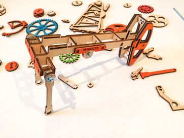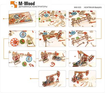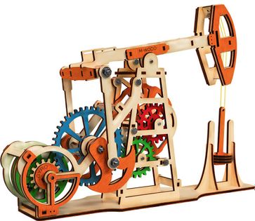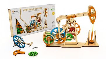 Деревянный конструктор полностью симулирует работу настоящей нефтяной вышки. Для интереса мы добавили в механизм гироскоп, который делает вращение более продолжительным. Основное колесо приводит в движение механизм, который раскачивает балансир. Насос, подвязанный на тросе, совершает движения вверх и вниз. Гироскоп поддерживает движение всего механизма. Что такое M-Wood? Mechanical Wood — не просто деревянный конструктор, а механическая головоломка. Юный инженер пройдет путь от изучения подробной трехмерной инструкции до запуска собранного механизма. Конструктор развивает мышление, логику, креатив, дает представление о принципах механики и кинематики. Безопасно. Конструкторы выполнены из натуральной древесины, отполированы и покрыты акриловой краской на водной основе. Краска имеет европейский сертификат и может применяться для покрытия игрушек и мебели для детей. Познавательно. Каждый конструктор имеет движущиеся механизмы, шестерни, рычаги. Для сборки применяются винты и гайки. К каждой игрушке разработана подробная трехмерная инструкция, в которой описан каждый шаг сборки в картинках. Интересно. В собранный конструктор можно играть! Причем получается не статичная, а полнофункциональная модель. Удобно. Для сборки конструктора не нужен клей. Все детали имеют замковые соединения. Инструменты для закручивания гаек находятся в комплекте. Конструктор поставляется в деревянной коробке, в которой удобно хранить детали при сборке, а после — разные мелочи. None