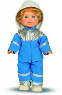Производитель оставляет за собой право изменения цветовой гаммы одежды и волос куклы, цвет глаз может варьироваться. Для развития содержания сюжетно-ролевых игр дети должны иметь представления о разнообразных занятиях взрослых. Кукла Митя из серии "Профи" — это характерная кукла, изображающая мальчика дошкольного возраста в стилизованном костюме спасателя. В комплект одежды куклы входит: рубашка, куртка, брюки. Комплект дополняют кроссовки. Рыжеватые волосы, веснушки, курносый нос, задорная улыбка создают образ симпатичного и озорного мальчишки, открытого к игре и общению. Фигура спасателя имеет особую популярность среди мальчишек, начиная с дошкольного возраста. Это привлекает детей и способствует их идентификации с данным персонажем. Игровые и дидактические возможности куклы Кукла Митя может быть так называемой "методической куклой" для знакомства детей с особенностями профессии. Особенно ценно, что кукла имеет образ мальчика, подходит для мужской идентификации и, соответственно, для сюжетной игры мальчиков. Наличие элементов одежды, которые легко снимаются и надеваются, позволяет переодевать куклу, то есть легко менять образ и представлять Митю в любой другой роли. В процессе игры развивается мелкая моторика и творческое воображение ребенка. При нажатии на звуковое устройство, вставленное в спинку, кукла произносит фразы. У куклы прошитые волосы из качественного нейлона, похожие на натуральные. Игрушка имеет оптимальный размер для игры ребенка (34 см). Митя озвучен. Глаза вставные не закрывающиеся. Тело куклы пропорционально. Ручки и голова выполнены из эластичного, приятного на ощупь винила, а туловище и ноги из пластмассы. Кукла качественно сделана, она достаточно устойчива, имеет подвижные конечности, благодаря чему может стоять, сидеть и принимать различные позы. Кукла произносит следующие фразы: — Мы в профессии играем… — По душе их выбираем… — И мечтаем поскорее… — Мамы с папой стать взрослее. — Чтоб не просто так меч
