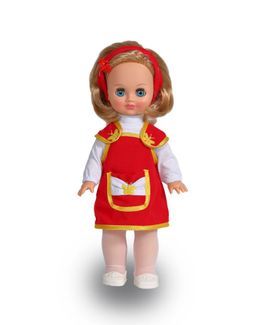 Производитель оставляет за собой право изменения цветовой гаммы одежды и волос куклы, цвет глаз может варьироваться. У милой куклы Натальи от фабрики Весна ясные голубые глаза и блестящие русые волосы. На ней надеты красный сарафанчик с вышивкой, беленькие водолазка, колготки и туфельки. У Натальи закрываются глазки, и она умеет разговаривать. При нажатии на звуковое устройство, вставленное в спинку, кукла произносит следующие фразы: — Мама, мама, — Улыбнись! — Завяжи мне бантик. — Хочу гулять. — Есть хочу. — Дай мне конфетку! — Расскажи сказку. — Расскажи еще! — Хочу спать. — Спокойной ночи! Очаровательная кукла Весна покорит сердце любой девочки! Обаятельный внешний вид и прелестные одежки игрушечных красавиц вызывают только самые добрые и положительные эмоции. Куклы производятся на российских фабриках из нетоксичных, безопасных для детей материалов. Они отличаются высоким качеством, проработанностью деталей и гармоничными пропорциями тела. Голова и ручки кукол изготовлены из эластичного винила, очень приятного на ощупь, а туловище и ножки — из прочной пластмассы. У кукол густые мягкие волосы, которые можно мыть, расчесывать и заплетать как только захочется. Они прочно закреплены и способны выдержать практически любые творческие порывы ребенка. Особый восторг у маленьких модниц вызывают нарядные костюмы, которые можно снимать и менять. Дополнительно к куклам выпускаются самые разнообразные комплекты одежды. С прелестной куклой отечественного производства возможно не просто весело проводить время, но и научиться одеваться по сезону. Игра с очаровательными куклами поможет развить мелкую моторику, а возможность менять костюмчики и прически формирует эстетический вкус. Милая игрушка станет лучшей подружкой для девочки и научит ребенка доброте и заботе о других. Минимальная сумма заказа 500 руб.