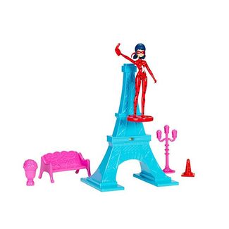 В состав набора входит Эйфелева башня, фигурка Леди Баг с подвижными руками и ногами и специальный держатель.Леди Баг - супергероиня, которая спасет Париж от злодеев. В конспирации ей помогает ее красный костюм в черный горох с маской на лицо. Превращение из школьницы Маринетт в Леди Баг осуществляется с помощью волшебного существа квамми по имени Тикки. Он похож на божью коровку и обожает сладенькое. Когда Маринетт превращается в Леди Баг, Тикки становится ее сережками.Специальный держатель можно установить на верхушку Эйфелевой башни, а на другом конце закрепить фигурку Леди Баг. Вращаясь, она может сбивать пластины с изображениями злодеек на подставках:• Рефлекта - злодейка, которая превращает других в своих двойников (только внешне).• Непогода - злодейка, которая способна управлять погодой: вызывать дождь, град, ветер, бурю.Игру разнообразят дополнительные аксессуары: скамейка, горшок с цветком, фонарь и другие. None