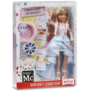 Серия кукол Project MС2 основана на одноименном сериале, в котором красивые и крутые девчонки любят учиться. Ведь наука совсем не мешает ухаживать за собой и следить за модными тенденциями. На этот раз девочки выполняют секретную миссию на Маскараде. Их образы выглядит необычно и интересно. Адрианна выглядит просто роскошно. У неё мягкие светлые волосы с эффектом омбре, карие глаза, обрамленные длинными пушистыми ресничками и тенями, и розовые губки. Она одета в жемчужный топ, юбку с голубым каскадным подолом, розовую курточку, носки и босоножки на высоком каблуке. Ее образ можно дополнить короной, очками, ожерельем или маской. Также у данной куколки повышена подвижность: руки сгибаются в локтях и кистях, а ноги в коленях. Благодаря этому Адрианна сможет принимать множество различных поз. С таким набором девочка сможет не только поиграть в куклы, но и создать собственное лимонное мыло. Для этого в наборе есть формочка и разделитель. Дополнительно вам понадобится пищевой краситель, экстракт лимона, мыльная основа, миска для СВЧ, спиртосодержащий раствор, емкость с распылителем, нож и прихватки – продаются отдельно! Сделать мыло несложно: