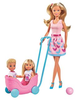 Отличный набор для сюжетных игр. В него входят три куклы, две фигурки питомцев и множество аксессуаров. Штеффи с малышами отправляется на веселую прогулку! В комплекте Кукла Штеффи 29 см. Кукла Еви 12 см. Кукла Тимми 12 см. Коляска Щенок Котенок Аксессуары Внимание! Набор содержит мелкие детали. Использовать только под непосредственным наблюдением взрослых. None