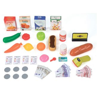 Игрушечный супермаркет включает в себя электронный кассовый аппарат, настоящий калькулятор со встроенным жидкокристаллическим экраном, электронный сканер со звуком и светом, механические весы, считывающее устройство для пластиковых карт и чековпечатающим аппаратом... и еще много других интересных функций. Положите все ваши продукта в тележку, вставьте карточку в считывающее устройство, возьмите распечатанный чек!Большое игровое пространство: зона свежих продуктов + зона выпечки.В комплект входят муляжи продуктов.В комплект входит тележка.Всего в комплекте 41 предмет. Возраст - от 3 до 6 лет. None