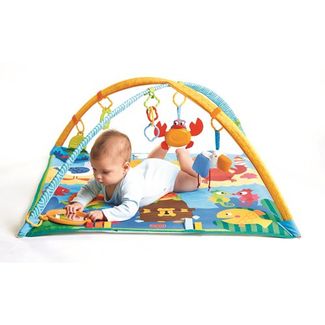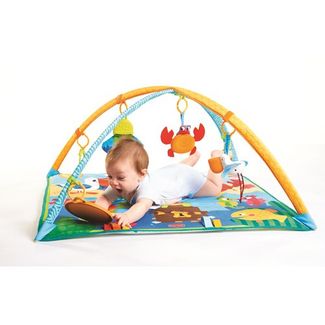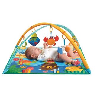 Разноцветная поляна для увлекательных игр.Коврик «Морские приключения» - удивительная конструкция для малыша, на которой можно лежать и ползать, рассматривать яркие рисунки и изучать предметы. Сверху крепятся две большие дуги, на которых в разном порядке можно повесить красивые игрушки. Внизу есть колечко для круглого зеркала, в котором ребенок с удовольствием будет рассматривать себя. Все крепления передвижные, соответственно высоту зеркала и любой игрушки можно регулировать.Использовать развивающие коврики могут малыши разного возраста - самые крохотные будут лежать и развлекаться с подвешенными игрушками, а дети старше с удовольствием будут ползать и изучать встроенные шуршащие элементы. По мере роста ребенка ему будет более интересен музыкальный краб, в котором записано 9 различных мелодий. У малыша будет развиваться музыкальное восприятие, а также понимание причинно-следственных связей.Некоторые игрушки, подвешенные сверху с пищащими и шуршащими элементами.В игрушки для новорожденных входят: коврик, 2 сьемные дуги, безопасное зеркало, музыкальный краб, прорезыватель, погремушка, подвесная игрушка.На коврике самый маленький будет с удовольствием лежать и рассматривать висящие предметы, а когда ребенок начнет переворачиваться, он сможет наблюдать за своим выражением лица в зеркале, нажимать на яркие рисунки и находить тайнички с шуршащими элементами.Покупать коврик от Tiny Love рекомендуется малышам от рождения до года.Продукция сертифицирована, экологически безопасна для ребенка, использованные красители не токсичны и гипоаллергенны. None