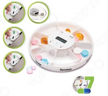 Органайзер с таймером для таблеток Bradex KZ 0439 замечательный помощник в своевременном приеме медикаментов, витаминов или добавок. Используйте его дома и во время поездки, на работе. Контейнер разделен на 7 секций, каждая соответствует дню недели. В середине рабочая панель с экраном и кнопками для настройки времени приема. Органайзер рассчитан максимум на 4 пользователей. Контейнер для таблеток компактный и удобный в использовании. Отличный планировщик приема лекарств для членов семьи. Работает от 1 батарейки типа AG10. Корпус выполнен из качественного ABS-пластика. None Возможен самовывоз. Есть доставка.