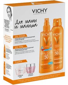 Набор Vichy Мама и Малыш - увлажняющий спрей-вуаль SPF 50 200 мл, спрей Идеаль Солей для детей SPF 50 200 мл, дневной крем-уход для нормальной и комбинированной кожи 15 мл и ночной бальзам-гель Идеалия Скин Слип 15 мл.