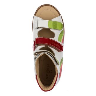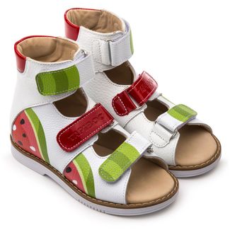 Эти ортопедические сандалии разработаны для коррекции стоп при вальгусной деформации, а также для профилактики плоскостопия. Применение данной модели рекомендовано детям при наличии сформировавшихся деформаций. Жесткий фиксирующий задник увеличенной высоты и возможность регулировки полноты тремя застежками велкро обеспечивают необходимую фиксацию голеностопа в правильном положении. Многослойная, анатомическая стелька со сводоподдерживающим элементом для правильного формирования стопы. Широкий, устойчивый каблук, специальной конфигурации - каблук Томаса. Подкладка из кожи теленка без швов. Кожа теленка обладает повышенной износостойкостью в сочетании с мягкостью и отличной способностью пропускать воздух для создания оптимального температурного режима (нога не потеет). Сандалии изготовлены из гладкой белоснежной кожи с ярким летним фруктовым принтом.Внимание! Фактический цвет изделия может незначительно отличаться от цвета на фотографии в связи с особенностями цветопередачи различных цифровых устройств. None