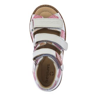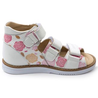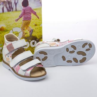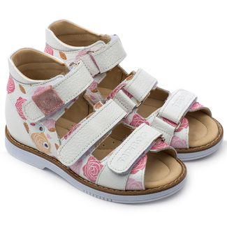 Классические сандалии с открытым носом из белоснежной гладкой кожи с летним цветочным принтом и серебристым логотипом на ремешке для ежедневной профилактики плоскостопия. Застежка на три ремешка с липучками для наилучшей фиксации ножки ребенка. Широкий, устойчивый каблук, специальной конфигурации «каблук Томаса». Каблук продлен с внутренней стороны до середины стопы, чтобы исключить вращение (заваливание) стопы вовнутрь (пронационный компонент деформации, так называемая косолапость, или вальгусная деформация). Многослойная, анатомическая стелька со сводоподдерживающим элементом для правильного формирования стопы. Благодаря использованию современных внутренних материалов позволяет оптимально распределить нагрузку по всей площади стопы и свести к минимуму ее ударную составляющую. Жесткий фиксирующий задник с удлиненным «крылом» надежно стабилизирует голеностопный сустав во время ходьбы, препятствуя развитию патологических изменений стопы. Упругая, умеренно-эластичная подошва, имеющая перекат позволяющий повторить естественное движение стопы при ходьбе для правильного распределения нагрузки на опорно-двигательный аппарат ребенка. Подкладка из кожи теленка без швов. Внимание! Фактический цвет изделия может незначительно отличаться от цвета на фотографии в связи с особенностями цветопередачи различных цифровых устройств. None