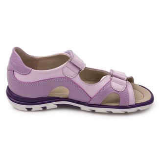 Открытые комфортные летние сандалии в спортивном стиле с открытым носом для девочек из мягкой гладкой кожи нежных сиреневых оттенков. Многослойная, анатомическая стелька со сводоподдерживающим элементом для правильного формирования стопы. Жесткий фиксирующий задник надежно стабилизирует голеностопный сустав во время ходьбы. Упругая, эластичная подошва позволяет повторить естественное движение стопы при ходьбе для правильного распределения нагрузки на опорно-двигательный аппарат ребенка. Две застежки типа велкро для наиболее комфортной фиксации на ноге ребенка.Внимание! Фактический цвет изделия может незначительно отличаться от цвета на фотографии в связи с особенностями цветопередачи различных цифровых устройств. None