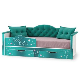 Кровать с ящиками одинарная Ноктюрн 180 01.34. Цвет - белый/берген азуре. Размер (ШхГхВ) 193х86х88 см., спальное место 800х1800 мм. Основание под матрас в комплекте, матрас приобретается отдельно. Очаровательная кровать с мягким фигурным изголовьем, декоративными подушечками и парой выдвижных ящиков в основании кровати станет любимым местом сна и отдыха Вашего ребёнка и ярким акцентом в интерьере детской комнаты. None Есть доставка.