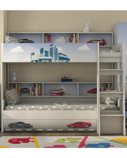Двухъярусная кровать Roomakid Тачки правая - компактная модель с нижним ящиком, 2 спальными местами, широкой лестницей и 2 блоками с открытыми полками. Материал - ЛДСП. Украшена рисунком. Для детей от 3 лет. Наличные, Visa/MasterCard, Яндекс.Деньги, WebMoney Возможен самовывоз. Есть доставка.