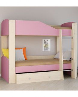 Детская двухъярусная кровать Астра 2 дуб молочный/розовый РВ мебель порадует вас, ведь она отличается компактностью и эффектным дизайном. Она подарит обоим детям уютные и просторные спальные места, при этом не "съедая" жизненное пространство в комнате.
