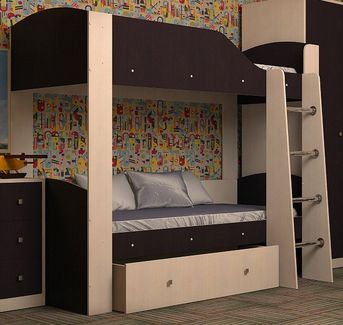 Детская двухъярусная кровать Астра 2 дуб молочный/венге РВ мебель порадует вас, ведь она отличается компактностью и эффектным дизайном. Она подарит обоим детям уютные и просторные спальные места, при этом не "съедая" жизненное пространство в комнате.