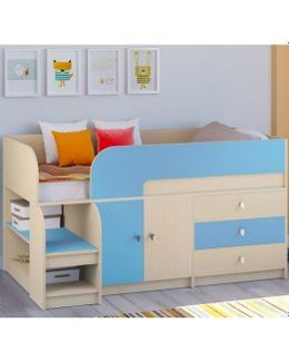 Кровать-чердак РВ Мебель Астра 9/1 молочный дуб/голубой - практичная модель с лестницей, 2 открытыми полками, шкафчиком и 3 ящиками. Сборка как влево, так и направо. Материал - ЛДСП, ПВХ. Для детей от 3 до 10-12 лет. Наличные, Visa/MasterCard, Яндекс.Деньги, WebMoney Возможен самовывоз. Есть доставка.