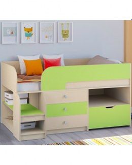 Кровать-чердак РВ Мебель Астра 9/5 молочный дуб/салатовый - практичная модель с лестницей, 3 открытыми полками, выкатным ящиком на колесиках и 3 выдвижными ящиками. Сборка как влево, так и направо. Материал - ЛДСП, ПВХ. Для детей от 3 до 10-12 лет. Наличные, Visa/MasterCard, Яндекс.Деньги, WebMoney Возможен самовывоз. Есть доставка.