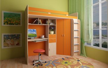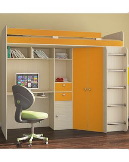 Детская кровать-чердак Астра 1 дуб молочный/оранжевый РВ мебель очень практичная и удобная. Она позволит даже самую маленькую детскую комнату сделать максимально комфортной и функциональной. Это целый мебельный комплекс, который включает в себя рабочую зону, спальное место, шкаф, стеллаж с ящиками и открытыми полками. Наличные, Visa/MasterCard, Яндекс.Деньги, WebMoney Возможен самовывоз. Есть доставка.