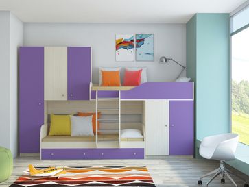 Двухъярусная кровать Лео дуб молочный/фиолетовая РВ мебель заменит большую часть мебели для детской комнаты. Вы получите два полноценных спальных места, а также шкафы, в которые можно сложить вещи двух детей. Наличные, Visa/MasterCard, Яндекс.Деньги, WebMoney Возможен самовывоз. Есть доставка.