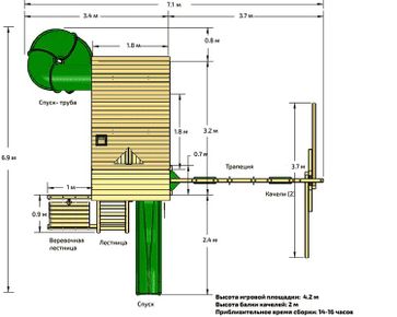 Детский игровой комплекс "Горный дом Deluxe" выполнен из отборных сортов кедра и секвои. В детском городке могут играть сразу несколько детей. Качаться на качелях, карабкаться по скалодрому, с визгом скатываться с горки - вот любимые забавы лета. В игре дети учатся общаться друг с другом, устраивать спортивные и сюжетные игры, тем самым навыки общения и модели поведения в обществе. Площадка предназначена для детей в возрасте от 3 до 11 лет. Детский игровой комплекс оснащен рулем, телескопом и перископом, флажками и колокольчиком. При выборе места для размещения площадки рекомендуется предусмотреть наличие свободной зоны шириной 1,8 метра по периметру игрового комплекса.Платформа первого уровня: высота – 1,5 метра;размеры - 1,80х2,40. Платформа второго уровня: высота – 2,1 метра;размеры - 0,90х1,80 метров.Функциональностьширокая безопасная лестница с металлическим ограждением;2 пластиковых горки: 3-х метровая с волной и спиральная;деревянные дом с окнами, дверьми и дымоходами;качели: 2 стандартных, трапеция с кольцами и шина-колесо (360 градусов);песочница. Габариты: 420 х 960 х 690 см None Можно купить без предварительного заказа. Возможен самовывоз. Есть доставка.