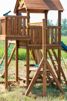 Преимущества комплекса ВЫШЕ ВСЕХ «Победа СПОРТ»:Функциональная детская игровая площадка ВЫШЕ ВСЕХ «Победа СПОРТ» с рукоходом и турником.Площадка оборудована горкой, качелями, сеткой для лазанья, рукоходом и скалодромом.Архангельская сосна из-за высокой плотности северной породы хорошо переносит влияние окружающей среды в средней полосе и обработана пропиткой против гниения и насекомых*.Под башней предусмотрено специальное место для песочницы.Древесина хвойных северных пород низкой степени влажности. Архангельская сосна.Брус клееный 8080, брус 8040, доска 9020.Лессирующая водно-дисперсионная пропитка на акриловой основе с фунгицидной защитой.Применяется для защитно-декоративной отделки деревянных поверхностей. Подчёркивает текстуру дерева и дополнительно укрепляет структуру. Значительно увеличивает срок службы деревянных поверхностей и НЕ содержит токсичных растворителей.Краска «резиновая».Экологическая и пожаробезопасная, эластичная и атмосферостойкая краска пропитывает основание на глубину до 3 мм., придаёт водостойкость деревянным элементам городков Выше Всех. Краткие технические характеристики:двухуровневая башня с балконом;выносной столик со скамейками;безопасная лестница с деревянными плоскими ступеньками;сетка для лазанья и скалодром;удобные поручни — 6 шт.;волнистая горка длиной 3 метра, высота ската 1,5 м;удобные качели- 2 шт.высота второго этажа 150 см.площадь башни: 120120 см.площадь балкона: 12072 см.декоративный фронтон и труба.флагшток с флагом России.штурвал.подзорная труба.турникрукоходРазмеры площадки:Для удобства и безопасности детей устанавливайте площадку на ровную поверхность, чтобы с каждой стороны было по 1,8 метра свободного пространства.Зона безопасности д.ш. 64605830ммРазмеры плошадки д.ш.в. 446038303370ммБашня д.ш.в. 124019603370мм (Высота уровня пола 1500мм)Балкон д.ш.в. 12808002400мм (Высота уровня пола 1750мм)Скалодромная горка д.ш.в. 120024302990мм (Высота уровня пола 1500мм)Рукоход д.ш.в. 260012002470ммТурник д.ш.в. 150