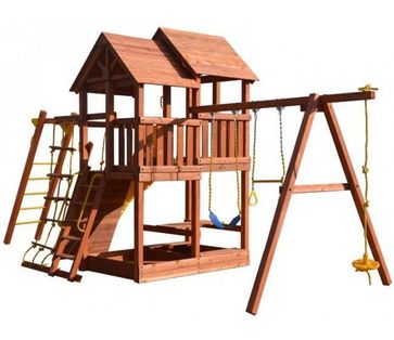 Комплектация игровой площадки SkyFort II стандарт с рукоходомДвухуровневый игровой домик с деревянной крышей и элементом “солнышко”, высота игровой платформы 1,42/1,52 метра, размеры игровой платформы 1,32*2,11 метраКачельная балка с «А» опорой 3-х позиционная: с мягкими качелями и качелями/трапецией с ручками на металлических цепях, покрытых пластиком, с качелями-диск пластиковый на канатеГорка с двойной волной, длиной 2,75 метраЛестница-рукоход «Манки-бар»Лестница с деревянными ступеньками и периламиВеревочная лестница с деревянными ступенькамиСкалодром с цветными “камнями” и канатомСтолик для пикника со скамейкойПесочницаИгровая панель “Крестики-нолики”ШтурвалТелесоп None Можно купить без предварительного заказа. Возможен самовывоз. Есть доставка.