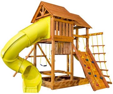 Игровая площадка "SkyFort Deluxe" с двухволновой горкой и горкой трубой:Двухуровневый игровой домик с деревянной крышей и элементом “солнышко”, высота игровой платформы 1,42/2,10 метра, размеры игровой платформы 1,32*2,11 метраКачельная балка с «А» опорой 3-х позиционная: с мягкими качелями и качелями/трапецией с ручками на металлических цепях, покрытых пластиком, с качелями-диск пластиковый на канатеГорка-труба пластиковая с поворотом на 270 градусовГорка с двойной волной, длиной 2,75 метраЛестница с деревянными ступеньками и периламиВеревочная лестница с деревянными ступенькамиСкалодром с цветными “камнями” и канатомСтолик для пикника со скамейкойПесочницаИгровая панель “Крестики-нолики”ШтурвалТелескоп None Можно купить без предварительного заказа. Возможен самовывоз. Есть доставка.