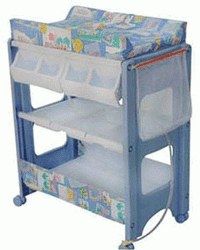 Многофункциональный стол для пеленания имеет встроенную ванночку, отсеки для различных принадлежностей, доску для пеленания, внизу корзинку. Пеленальный столик имеет два колеса и дренажную трубку. None