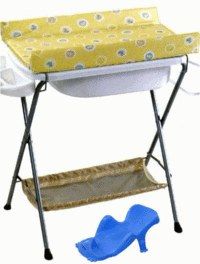 Многофункциональный стол для пеленания имеет встроенную ванночку, отсеки для различных принадлежностей, доску для пеленания, внизу корзинку. None