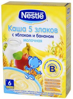 Быстрорастворимая молочная каша Нестле 5 злаков с яблоком и бананом, для детей старше 6 месяцев. Каша Нестле это полностью сбалансированное питание прикорма, когда грудное молоко или детская смесь не удовлетворяют потребностям растущего организма ребенка