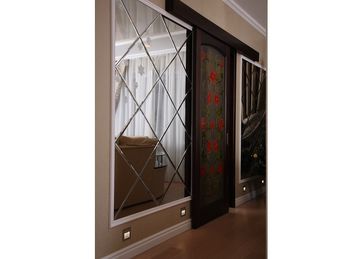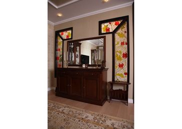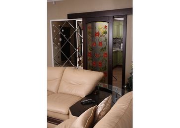 Витражные перегородки и кухонная дверь в технике росписи по стеклу. Роспись потока в едином мотиве с витражами и интерьером.