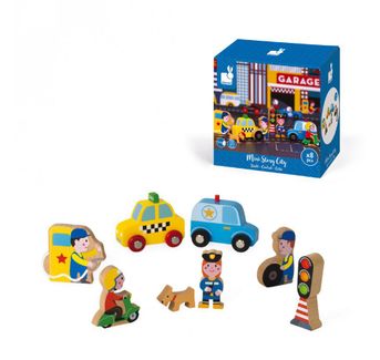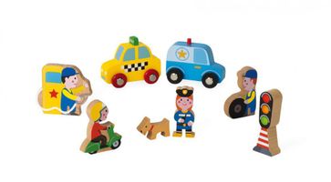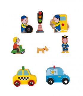 Мини-набор для большого разнообразия историй! "Транспорт в городе" содержит 8 деревянных фигурок. В комплекте Фигурки людей Фигурки машин Фигурка собаки Фигурка светофора Игровой набор разработан во Франции. Изготовлен из высококачественных материалов. None