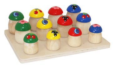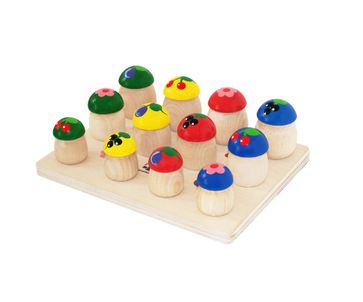 В комплект входит деревянная платформа и 12 грибочков разной формы и размеров (крепятся к платформе). Изделие ярко раскрашено и привлечет внимание ребенка в возрасте от одного года и старше. Развивает: умение соотносить разнородные предметы по цвету, форме, величине, навыки счетной и вычислительной деятельности, память, внимание и воображение, мелкую моторику рук, координацию движений. Используется как пособие в предметной деятельности. В ходе обучения знакомит со словами, необходимыми для регуляции выполняемых ими действий: такой же, разные, большой, маленький. Игра изготовлена из натуральных экологичных материалов: древесины бука, березы и липы. Расписана безопасными акриловыми красками. Они не тускнеют со временем, не стираются при интенсивном использовании — набор долго сохраняет свою привлекательность. None