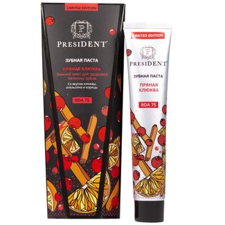 Зубная паста от President Limited Edition "Пряная клюква" - поддерживает местный иммунитет полости рта, укрепляет эмаль и возвращает естественную белизну. Пасты PresiDENT выпускаются компанией Бетафарма, история которой началась с исследовательской лаборатории, специализирующейся на разработке гигиенических, косметических и лекарственных средств в Италии. Множество клинических исследований, проведенных на кафедре стоматологии в МГУ, доказывают эффективность зубных паст в борьбе с налетом, кариесом и лечебным эффектом для десен. Контролируемая абразивность — это ключевая основа линейки зубных паст PresiDENT. Паста PresiDENT Пряная клюква содержит оптимальный уровень абразивности RDA=75, подходит для качественного ежедневного ухода. В качестве абразива используется диоксид кремния (silica) - наиболее безопасный для зубов, эффективно, но мягко удаляющий налет и полирующий эмаль, не повреждая ее. Зубная паста PresiDENT Пряная клюква обладает приятным клюквенным вкусом с пряными нотками гвоздики, корицы и апельсина. Активные компоненты: - Экстракт клюквы насыщает десны витаминами - Экстракт гвоздики подавляет рост бактерий - Кальций укрепляет зубную эмаль, насыщая ее минералами - Фториды (1350 ppm) реминерализируют эмаль, делаяя ее более устойчивой к кариесу.