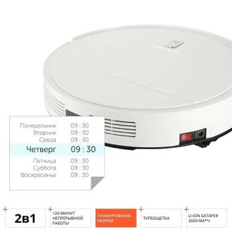 Redmond RV-R150 – робот-пылесос нового поколения для сухой и влажной уборки напольных покрытий в доме. В отличие от предыдущих моделей роботов-пылесосов, конструкция R150 усовершенствована – у прибора есть съемный контейнер для воды. Во время влажной уборки вода дозированно смачивает специальную насадку, благодаря чему, робот-пылесос не размазывает грязь, а эффективно удаляет ее. Цвет белый. Тип уборки влажная / сухая. Тип управления электронный. Время работы до 120 мин. Емкость аккумулятора 2600 mAh. Объем пылесборника 0,35 л. Уровень шума 65 дБ. Габаритные размеры 315х315х80 мм. None Возможен самовывоз.