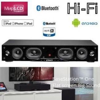 Звуковой проектор. Cистема домашнего кинотеатра, акустическая платформа для плоскопанельных телевизоров 40" - 65", совместимым аналоговым и цифровым входом, а также беспроводной технологией Bluetooth для устройств на базе iOS и Android. Максимальный вес телевизора 45 кг. Максимальные габариты подставки телевизора (Ш х Г), мм 640 х 330. Конфигурация системы 3-полосная с усилителем высокой мощноти класса D и DSP. ВЧ-динамик 2 х 19 мм, алюминиевый купольный. СЧ-динамик 2 х 75 мм, полипропиленовый конус. Сабвуфер 2 х 75 мм на 115 мм, полипропиленовый конус. Частотный диапазон 46 Гц - 24 кГц (-6 дБ). Tannoy BaseStation One приносит глубокий, богатый и невероятно мощный звук для телевизора. Доставляя больше мощности, чем традиционные звуковые панели, BaseStation One один блок, системы объемного звука для установки под телевизором или внутри / на верху Вашей аудио-видео мебели. Известные громкоговорители и сабвуфер, технологии Tannoy, DSP объемный звук и в пять раз больший усилитель мощности чем в большинстве плоскопанельных телевизоров. BaseStation One заполняет Вашу комнату звуком. С диапазоном входов, включая оптический цифровой, аналоговый и беспроводную технологию Bluetooth с apt-X технологией совершенствующей звук BaseStation One идеально подходит для домашнего кино, спортивных соревнований, музыки и речи. Простота подключения, проста в использовании и без проблем, BaseStation One аккуратно и удобно, как звуковая панель еще поставляет полноценный звук Tannoy. Система BaseStation One комплектуется пультом дистанционного управления, но управлять громкостью BaseStation One можно со штатного пульта телевизора. Отделка: Шлифованный черный корпус с черной решеткой гриля. Производитель: Великобритания. None