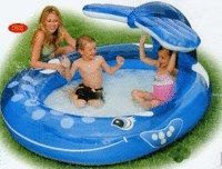 Овальный надувной бассейн в виде весёлого кита. Из ноздрей кита бьёт фонтанчик, а его хвост может служить тентом от солнца. None