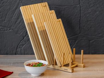 Комплект разделочных досок Bravo включает в себя три предмета и удобную подставку. Покупка такого набора устранит проблему эргономичного хранения досок и обработки продуктов из разных категорий и поможет украсить интерьер современной кухни.<br>