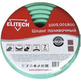Шланг поливочный четырехслойный нескручиваемый (DuraFless) ELITECH 1005.001800 необходим в любом приусадебном хозяйстве, на даче и даже в доме. Шланг обладает высокими прочностными характеристиками благодаря армированию и 4-х слойному изготовлению. Имеет защиту от истирания и от ультрафиолета. Может применяться отдельно - как обычный шланг, подсоединив его к крану, а также, возможно использование с насосами ELITECH. Способен выдержать давление от 7 до 20 бар. Допустимый температурный режим использования шланга 5-65°С. Длина шланга 25 м. Параметры шланга 3/4 * 2.5мм.