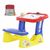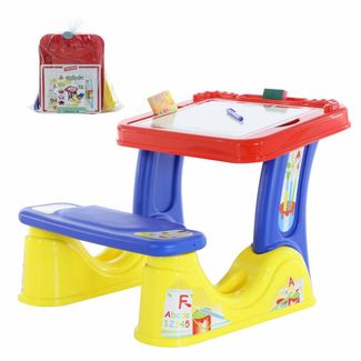 Парта соединена со скамейкой. Поверхность стола – съемная пластиковая панель, под которой находится органайзер для канцелярских принадлежностей. None